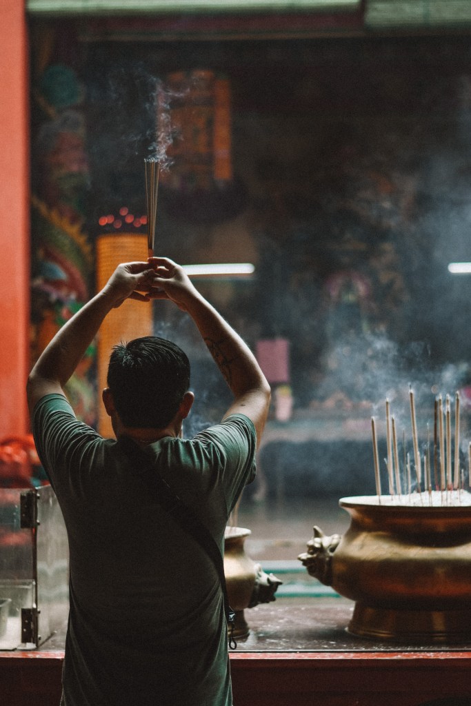 A man. Back to the world, offering incense to a sacred altar. The smoke gently rose, as if carrying his prayers and hopes to the sky. He seemed lost in deep devotion, every movement full of meaning.